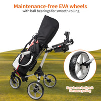 ✔Swivel Front Wheel with Lock: This 4-wheel golf push cart features a 360° front wheel with a secure lock option, making it easy to steer across all terrains—fairways, hills, or cart paths.